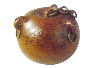 以古代事物制壶题铭是梅调鼎的又一特色。请看一款《汉铎壶》的铭文:“以汉之铎,为今之壶;土既代金,茶当呼荼。”铎是一种形如甬钟的大铃,腔内有舌,可摇击发声。舌有铜、木两种,称金铎、木铎。除作为乐器外,还有两大作用,古籍有“文事奋木铎,武事奋金铎”之说,木铎用于和平时期的文化宣传,金铎则用于战时军事召集或战场上鸣金收兵。汉铎即汉朝之铎。第一句是说壶型来源于汉铎。第二句“土既代金”点出了紫砂壶虽是陶土制作,但价比黄金。“茶当呼荼”,说的是唐代之前两字通用的典故。